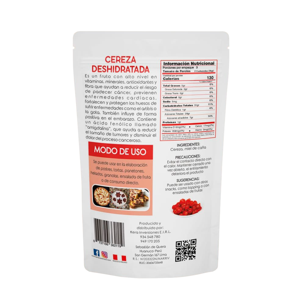 La Cereza Deshidratada mantiene su sabor intenso, dulce y ligeramente ácido, concentrando nutrientes en un snack práctico y versátil. Rica en antioxidantes, vitaminas y minerales, es ideal para apoyar la salud, disfrutar entre comidas o enriquecer recetas saludables.